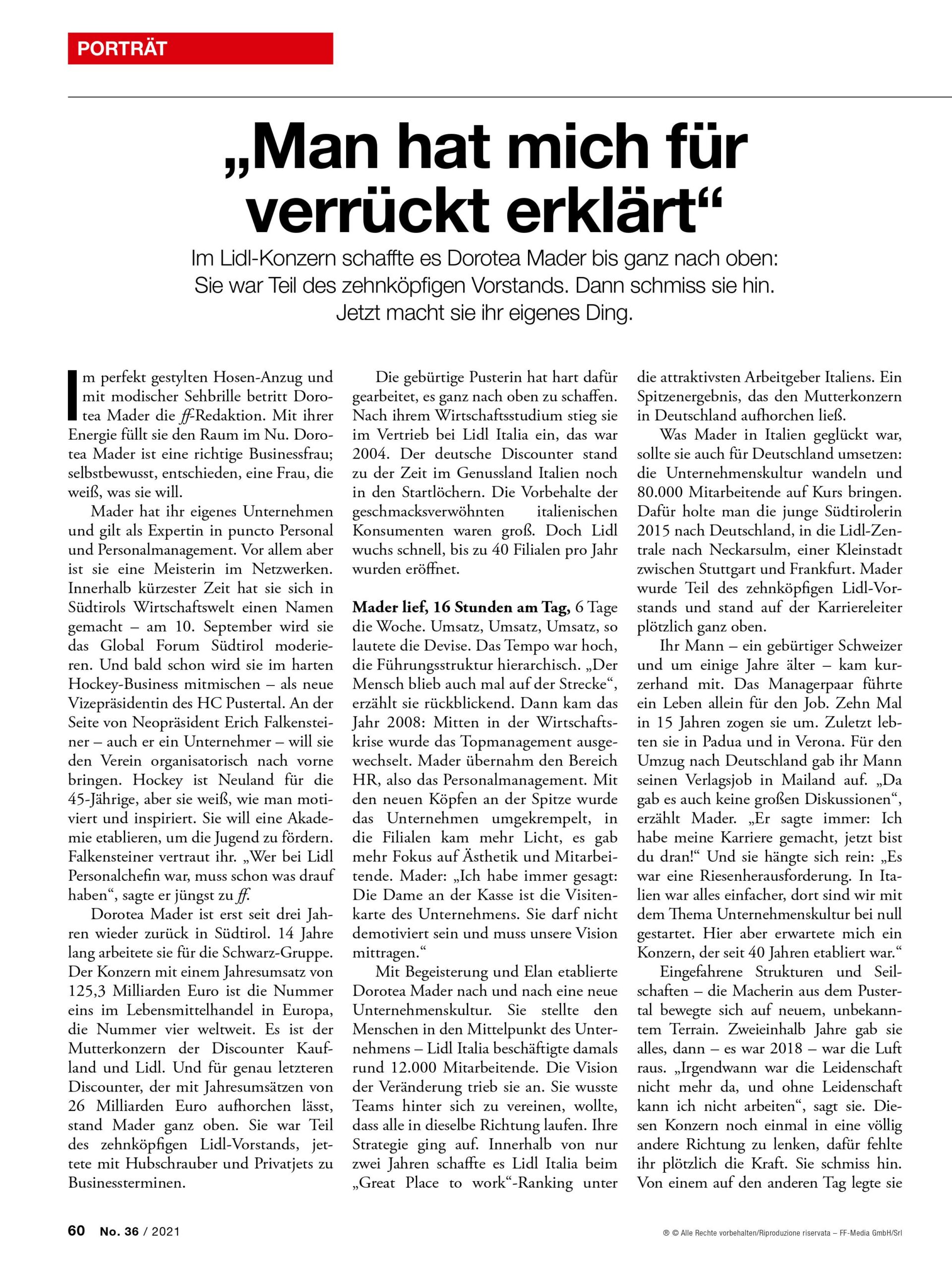 ff-Das Südtiroler Wochenmagazin – Im Lidl-Konzern schaffte es Dorotea Mader bis ganz nach oben: Sie war Teil des zehnköpfigen Vorstands. Dann schmiss sie hin. Jetzt macht sie ihr eigenes Ding.