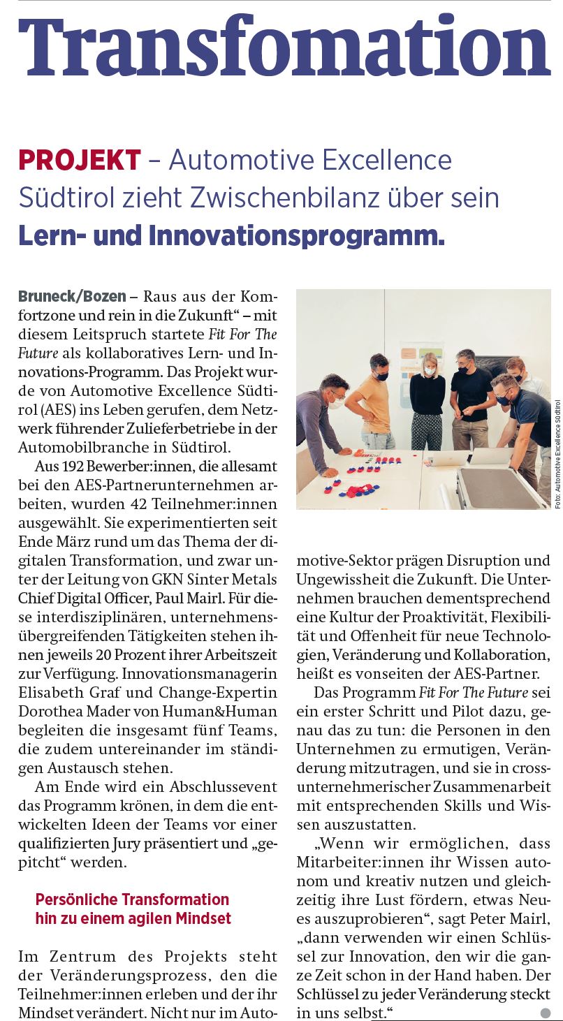 Bruneck/Bozen – Raus aus der Komfortzone und rein in die Zukunft“ – mit diesem Leitspruch startete Fit For The Future als kollaboratives Lern- und Innovations- Programm. Das Projekt wurde von Automotive Excellence Südtirol (AES) ins Leben gerufen, dem Netzwerk führender Zulieferbetriebe in der Automobilbranche in Südtirol. Aus 192 Bewerber:innen, die allesamt bei den AES-Partnerunternehmen arbeiten, wurden 42 Teilnehmer:innen ausgewählt. Sie experimentierten seit Ende März rund um das Thema der digitalen Transformation, und zwar unter der Leitung von GKN Sinter Metals Chief Digital Officer, Paul Mairl. Für diese interdisziplinären, unternehmensübergreifenden Tätigkeiten stehen ihnen jeweils 20 Prozent ihrer Arbeitszeit zur Verfügung. Innovationsmanagerin Elisabeth Graf und Change-Expertin Dorothea Mader von Human&Human begleiten die insgesamt fünf Teams, die zudem untereinander im ständigen Austausch stehen. Am Ende wird ein Abschlussevent das Programm krönen, in dem die entwickelten Ideen der Teams vor einer qualifizierten Jury präsentiert und „gepitcht“ werden. Im Zentrum des Projekts steht der Veränderungsprozess, den die Teilnehmer:innen erleben und der ihr Mindset verändert. Nicht nur im Auto- Wassermotive- Sektor prägen Disruption und Ungewissheit die Zukunft. Die Unternehmen brauchen dementsprechend eine Kultur der Proaktivität, Flexibilität und Offenheit für neue Technologien, Veränderung und Kollaboration, heißt es vonseiten der AES-Partner. Das Programm Fit For The Future sei ein erster Schritt und Pilot dazu, genau das zu tun: die Personen in den Unternehmen zu ermutigen, Veränderung mitzutragen, und sie in crossunternehmerischer Zusammenarbeit mit entsprechenden Skills und Wissen auszustatten. „Wenn wir ermöglichen, dass Mitarbeiter:innen ihr Wissen autonom und kreativ nutzen und gleichzeitig ihre Lust fördern, etwas Neues auszuprobieren“, sagt Peter Mairl, „dann verwenden wir einen Schlüssel zur Innovation, den wir die ganze Zeit schon in der Hand haben. Der Schlüssel zu jeder Veränderung steckt in uns selbst.”