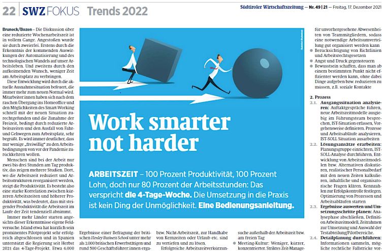 Bruneck/Bozen – Die Diskussion über eine reduzierte Wochenarbeitszeit ist in vollem Gange. Angestoßen wurde sie durch zweierlei. Erstens durch die Erkenntnis der kommenden Auswirkungen der Automatisierung und des technologischen Wandels auf unser Arbeitsleben. Und zweitens durch den aufkeimenden Wunsch, weniger Zeit am Arbeitsplatz zu verbringen.