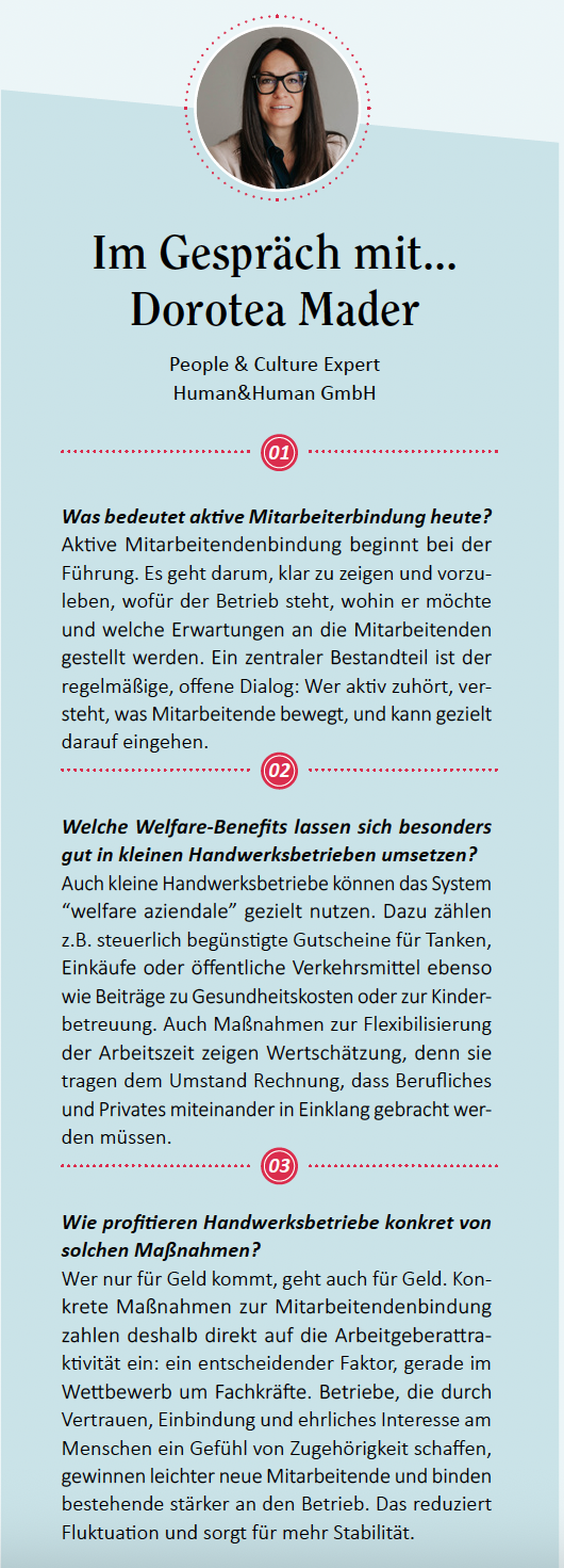 LVH manufakt –Mitarbeitendenbindung lebt von klarer Führung, echter Wertschätzung und smarten Benefits. Warum das gerade für Handwerksbetriebe entscheidend ist, erzählt Dorotea Mader im LVH manufakt.