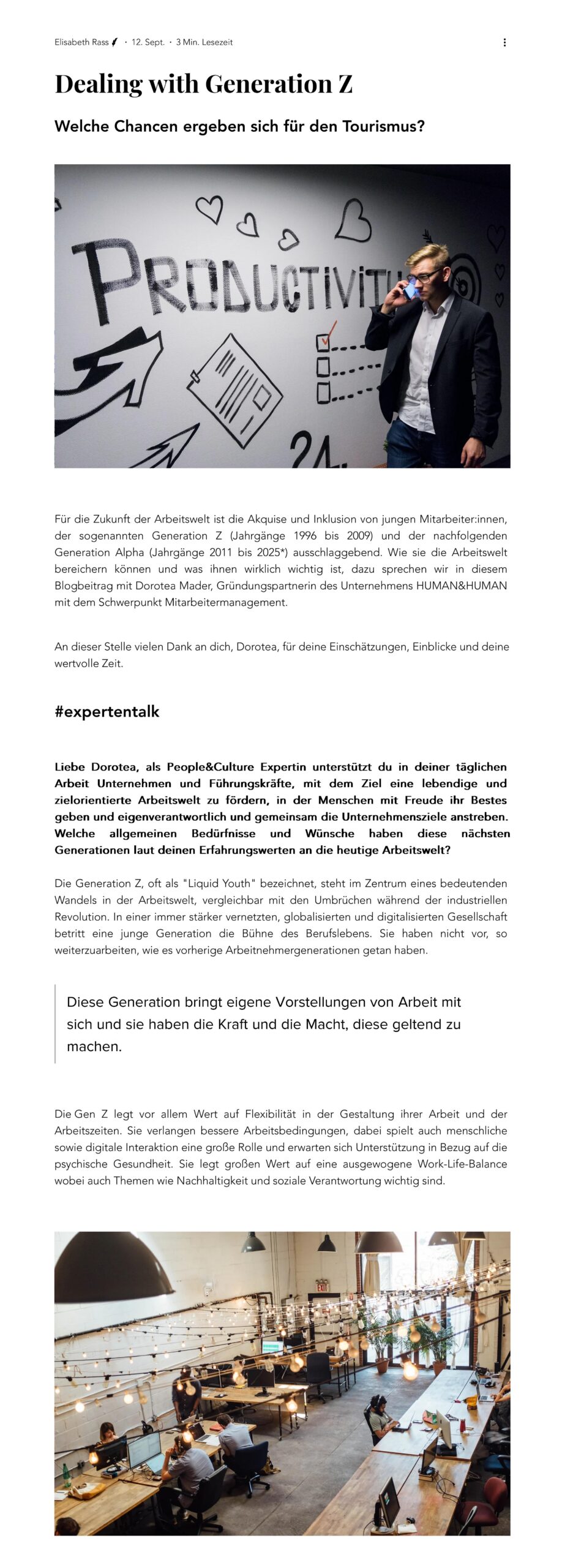 tourisma.eu – Für die Zukunft der Arbeitswelt ist die Akquise und Inklusion von jungen Mitarbeiter:innen, der sogenannten Generation Z (Jahrgänge 1996 bis 2009) und der nachfolgenden Generation Alpha (Jahrgänge 2011 bis 2025*) ausschlaggebend. Wie sie die Arbeitswelt bereichern können und was ihnen wirklich wichtig ist, dazu spricht Dorotea Mader, Gründungspartnerin des Unternehmens HUMAN&HUMAN in diesem Blogbeitrag.