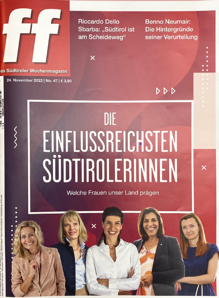 ff- Das Südtiroler Wochenmagazin – Welche Frauen unser Land prägen. Im Land gibt es zwar mehr Frauen als Männer, doch nur langsam verschaffen sie sich Gehör. ff hat eine Liste erstellt, welche Frauen den Weg dafür bereiten.