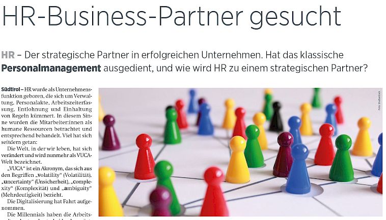 Südtirol – HR wurde als Unternehmensfunktiongeboren, die sich um Verwaltung,Personalakte, Arbeitszeiterfassung, Entlohnung und Einhaltung von Regeln kümmert. In diesem Sinne wurden die Mitarbeiter:innen alshumane Ressourcen betrachtet und entsprechend behandelt. Viel hat sichseitdem getan: Die Welt, in der wir leben, hat sich verändert und wird nunmehr als VUCAWelt bezeichnet. „VUCA“ ist ein Akronym, das sich aus den Begriffen „volatility“ (Volatilität), „uncertainty“ (Unsicherheit), „complexity“ (Komplexität) und „ambiguity“ (Mehrdeutigkeit) bezieht. Die Digitalisierung hat Fahrt aufgenommen. Die Millennials haben die Arbeitswelt erobert und entscheidend geprägt. Ein Virus beeinfl usst seit einiger Zeit maßgeblich unser Leben. Dass HR in dieser neuen Zeit genauso funktionieren kann wie damals, ist eine Illusion. Die Personaler:innen müssen sich weiterentwickeln, und ihre Rolle muss sich weiterentwickeln. Der/Die Personaler:in muss mehr und mehr