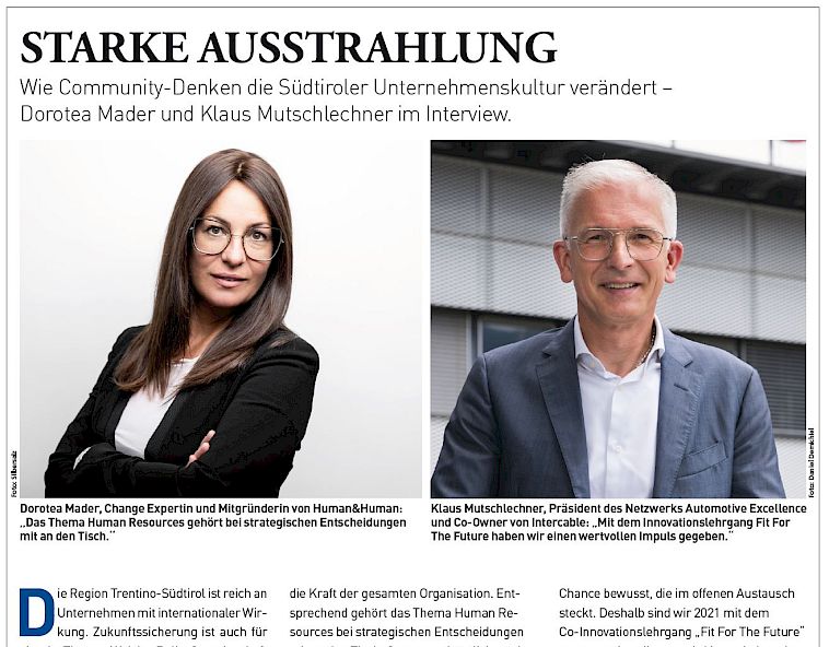 Die Region Trentino-Südtirol ist reich an Unternehmen mit internationaler Wirkung. Zukunftssicherung ist auch für sie ein Thema. Welche Rolle Gemeinschaft dabei spielt, haben wir mit Dorotea Mader, Change Expertin und Mitgründerin von HUMAN&HUMAN und mit Klaus Mutschlechner, Präsident des Netzwerks Automotive Excellence und Co-Owner von Intercable besprochen.