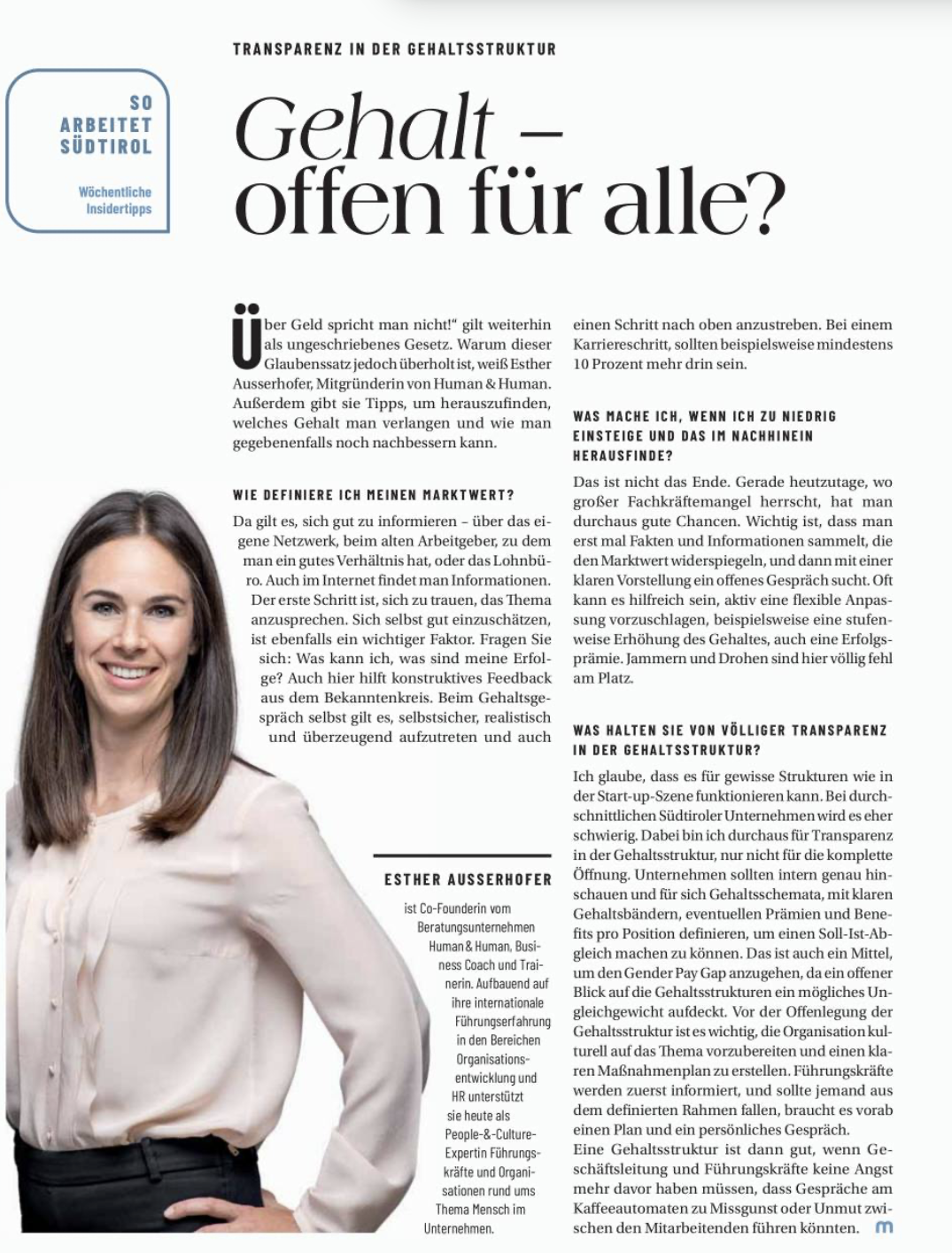 Markt Südtirol – „Über Geld spricht man nicht“ – ein überholter Leitsatz, findet Esther Ausserhofer. Die Mitgründerin von HUMAN&HUMAN erklärt, warum Gehaltstransparenz wichtig ist, wie man den eigenen Marktwert bestimmt und was hilft, um im Gespräch nachzubessern.