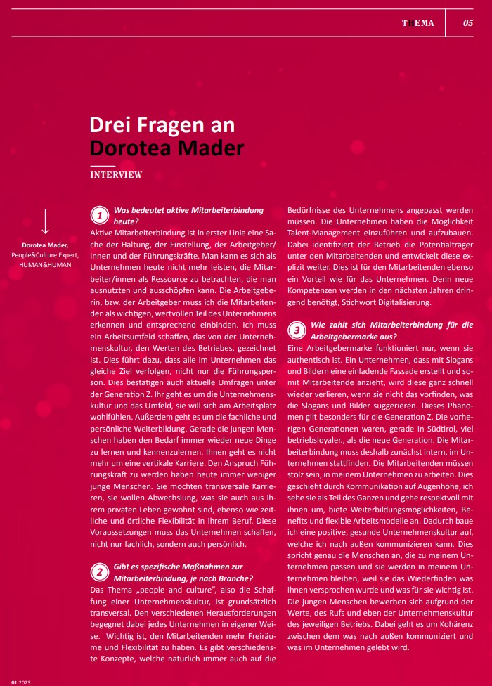 H-Thema Das Imagemagazin der Südtiroler Wirtschaft – Dorotea Mader gewährt Einblicke in ihre Expertise zur aktiven Mitarbeiterbindung. Im Rahmen eines Interviews erläutert sie drei entscheidende Fragen, die sich mit der Bedeutung von Mitarbeiterbindung, branchenspezifischen Maßnahmen und den Auswirkungen auf die Arbeitgebermarke beschäftigen.